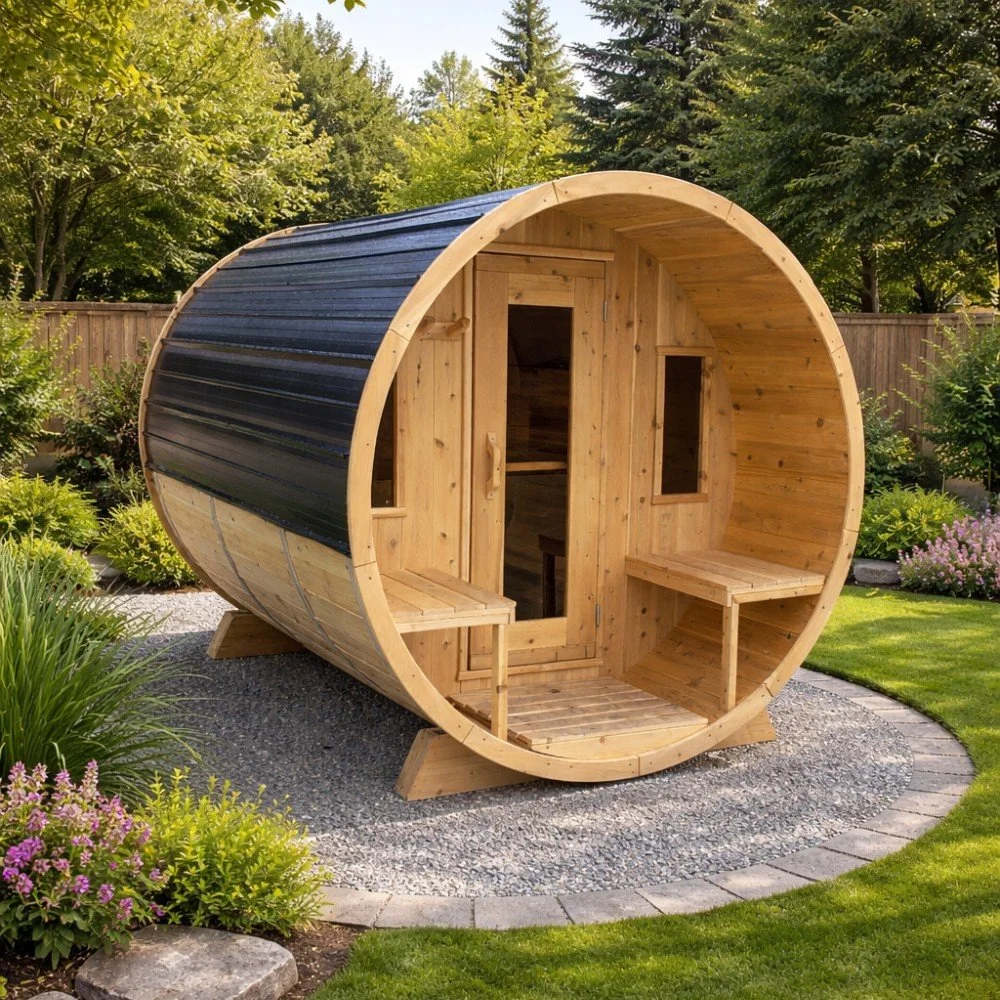 A barrel sauna with a 2-foot porch is a cylindrical outdoor sauna that includes a small front overhang or platform extending about two feet from the entrance. The added porch provides a convenient spot for stepping in and out, placing towels or sandals, and enhances both the functionality and curb appeal of the sauna.